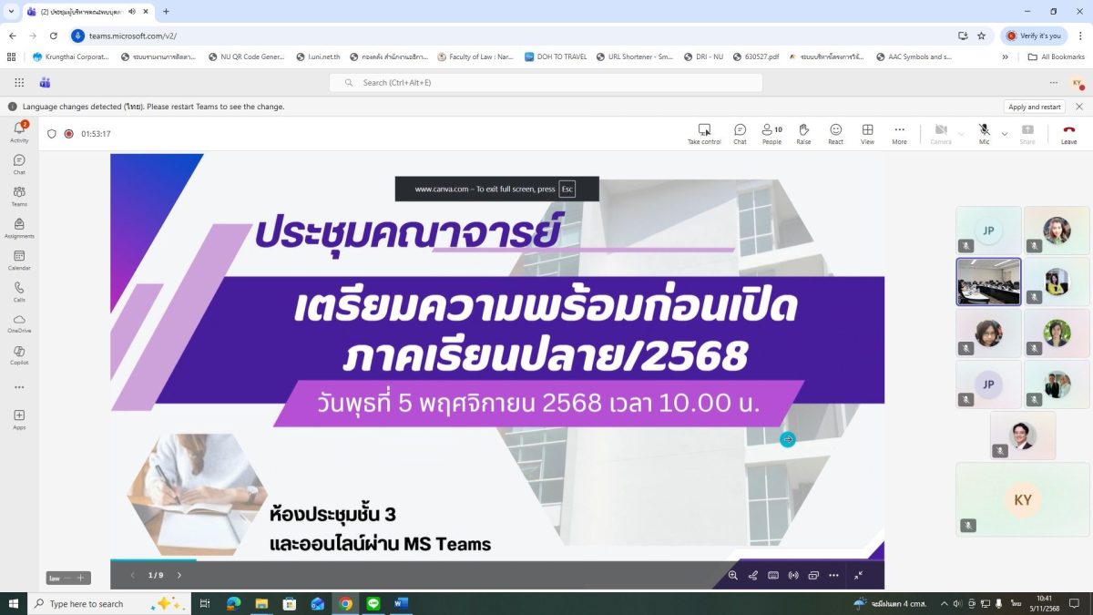 วันที่ 5 พฤศจิกายน 2568 รองศาสตราจารย์ ดร.บุญญรัตน์ โชคบันดาลชัย คณบดีคณะนิติศาสตร์ เป็นประธานที่ประชุมผู้บริหารคณะพบบุคลากรคณะนิติศาสตร์ เพื่อเตรียมความพร้อมก่อนเปิดภาคเรียนที่ 2/2568 และแจ้งนโยบายแนวทางการบริหารงานในแต่ละด้านของคณะ ณ ห้องประชุมชั้น 3 อาคารคณะนิติศาสตร์ มหาวิทยาลัยนเรศวร และรูปแบบออนไลน์ ผ่านโปรแกรม Microsoft Teams