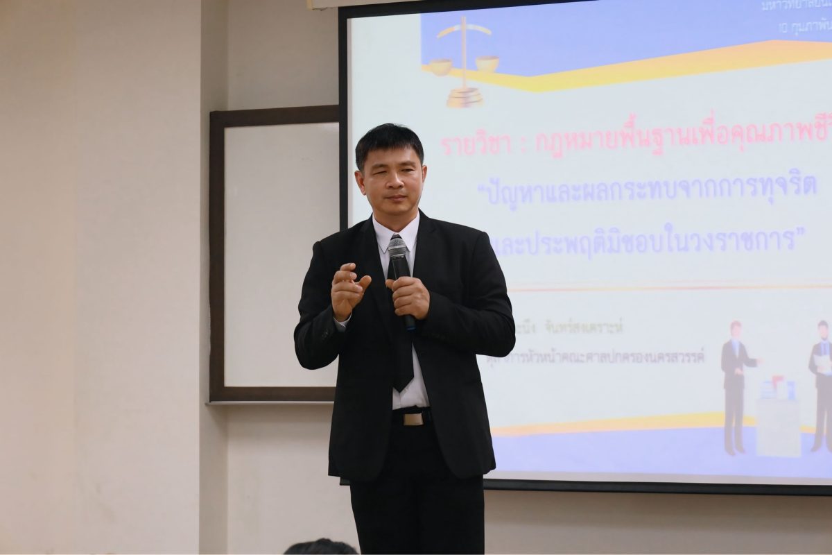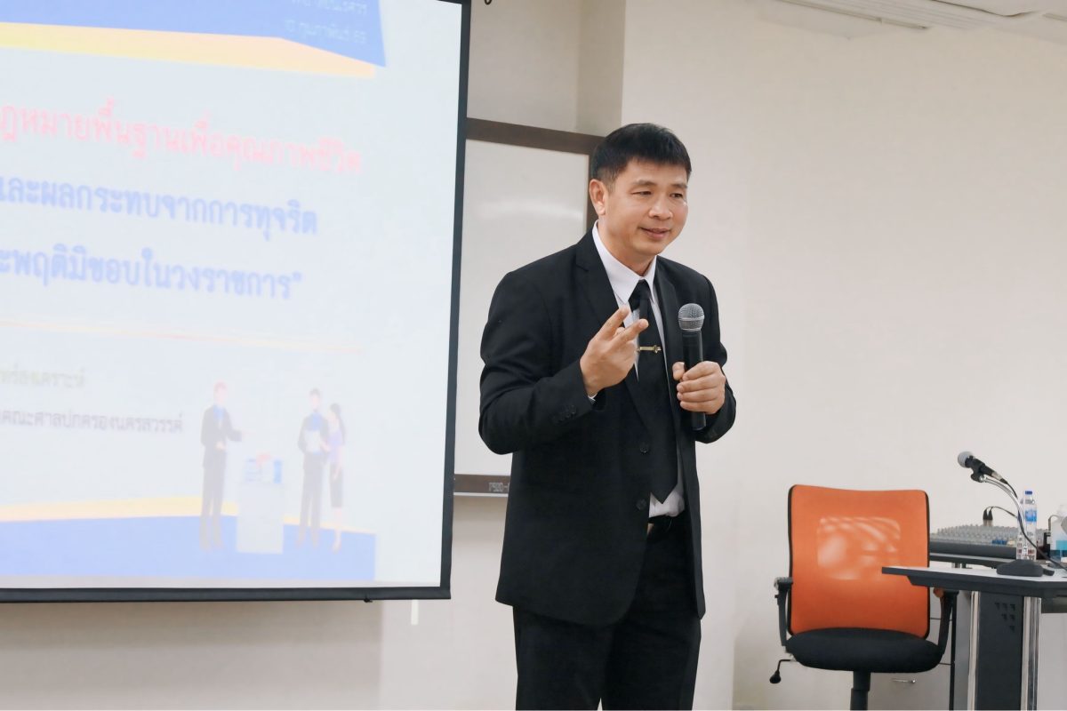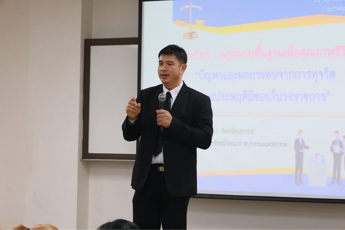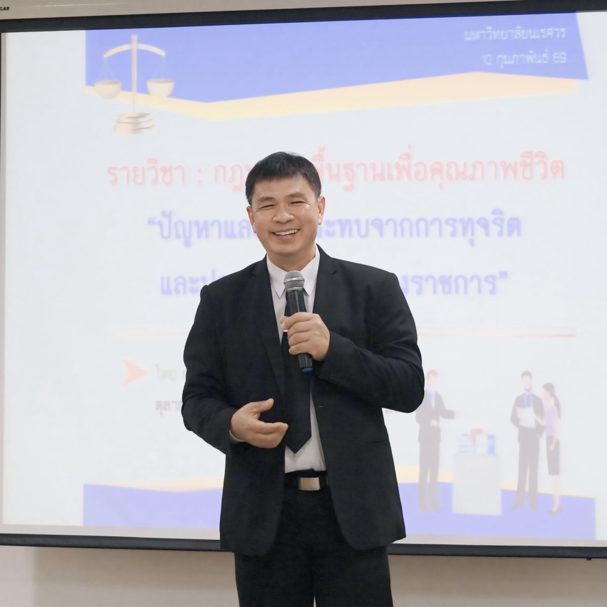 วันที่ 10 กุมภาพันธ์ 2569 คณะนิติศาสตร์ มหาวิทยาลัยนเรศวร จัดกิจกรรมการบรรยายพิเศษในหัวข้อเรื่อง “ปัญหาและผลกระทบจากการทุจริตและประพฤติมิชอบในวงราชการ” โดยได้รับเกียรติจาก นายคะนึง จันทร์สงเคราะห์ ตุลาการหัวหน้าคณะศาลปกครองนครสวรรค์ เป็นวิทยากรบรรยายให้นิสิตชั้นปี 1 และชั้นปี 2 ซึ่งเป็นส่วนหนึ่งของการศึกษาในรายวิชากฎหมายพื้นฐานเพื่อคุณภาพชีวิต ณ ห้องปราบไตรจักร 43 อาคารปราบไตรจักร 1 มหาวิทยาลัยนเรศวร
