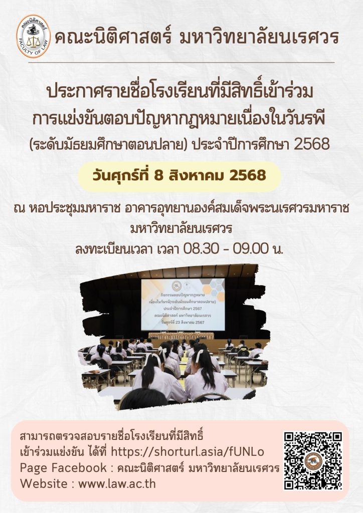 ✨✨✨ประกาศรายชื่อโรงเรียนที่มีสิทธิ์เข้าร่วมการแข่งขันตอบปัญหากฎหมายเนื่องในวันรพี (ระดับมัธยมศึกษาตอนปลาย) ประจำปีการศึกษา 2568⚖️⚖️⚖️